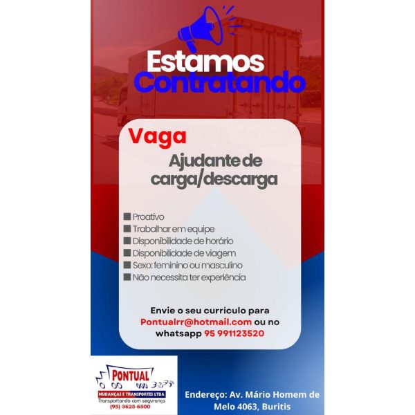 VAGA: AJUDANTE DE CARGA E DESCARGA. REQUISITOS: - Proativo - Trabalhar em equipe - Disponibilidade de horário - Disponibilidade de viagem - Sexo: feminino e masculino - Com e sem experiência Enviar currículo por email: pontualrr@hotmail.com