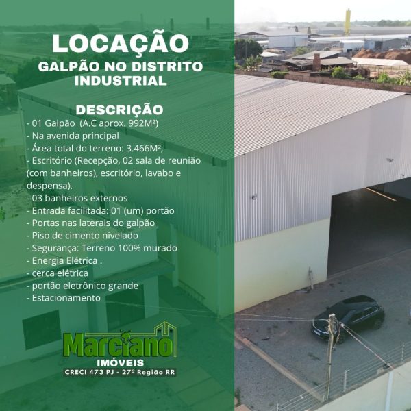 MARCIANO IMÓVEIS CRECI 473-PJ, 27ª Região/RR. LOCAÇÃO| GALPÃO NO DISTRITO INDUSTRIAL RUA ALEXANDRE BARBOSA MONTEIRO. Bairro Governador Aquilino Mota Duarte, DISTRITO INDUSTRIAL. 📝 Descrição: * Área total do terreno: 3.466M² * Galpão Industrial (área construída aprox. 992M²) * Escritório (área construída aprox. 159M²) * Banheiro externo (área construída aprox. 22,40M²) 💰 Valor do aluguel: R$ R$ 35.000.000,00 (Trinta e cinco mil reais) 🔒 Calção: 2 (dois) no mesmo valor de aluguel Característica Geral do Imóvel * Entrada facilitada: 01 (um) portão de altura para caminhões e 2 (dois) portões laterais. * Piso de cimento nivelado que garante durabilidade. * Segurança: Terreno 100% murado com cerca elétrica e portão eletrônico grande. * Espaço interno: Pé-direito alto e boa iluminação natural. * Estacionamento amplo disponível para clientes e colaboradores. * Instalações: 03 banheiros externos e um cômodo reservado para escritório ou reuniões. ESCRITÓRIO: Recepção, 02 sala de reunião (com banheiros), escritório, lavabo e despensa. 📱AGENDE UMA VISITA: (95)99126-1002 WhatsApp ou Ligações Daniel Fragoso Corretor de Imóveis CRECI 721